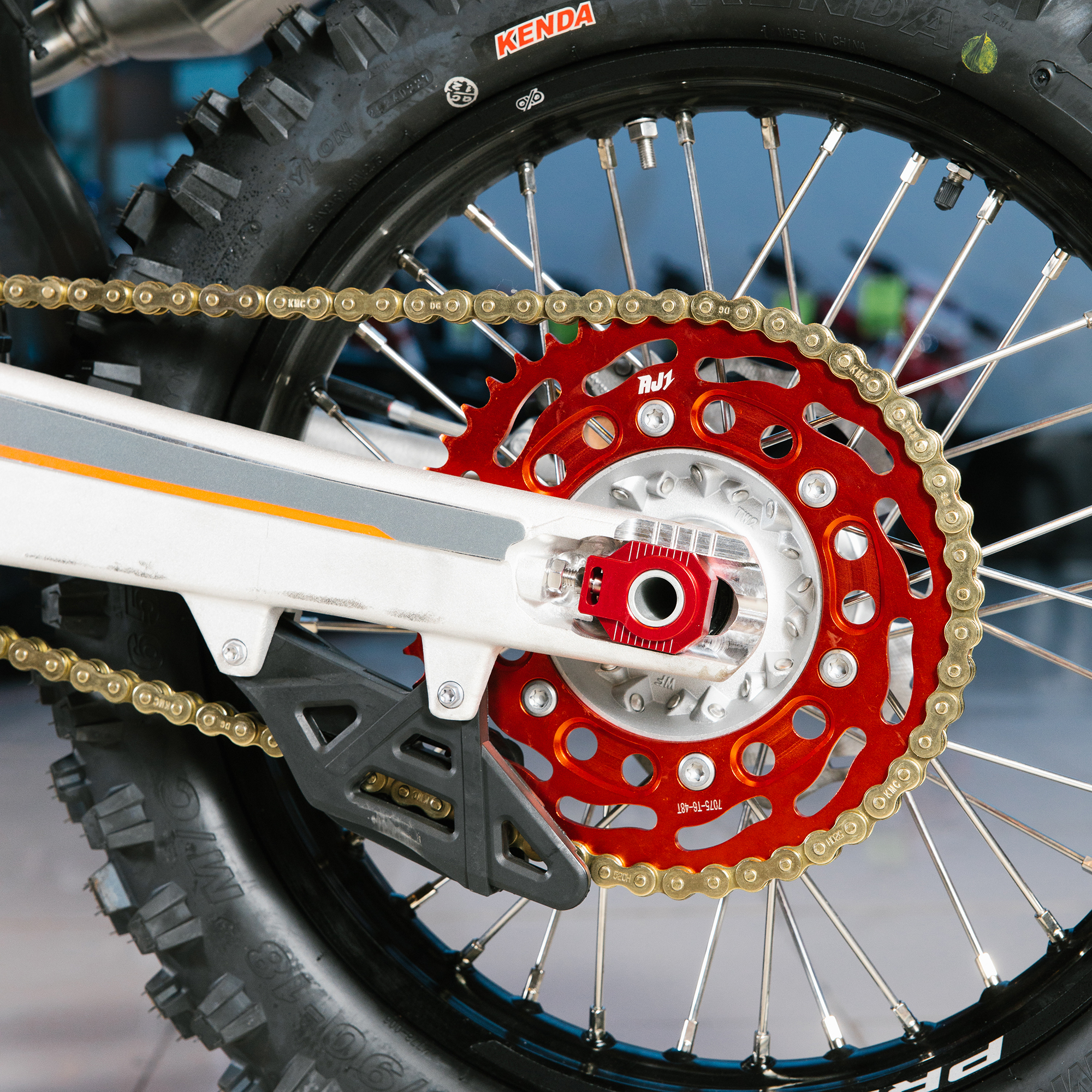 Спереди и сзади установлены антибуксаторы бренда "AJ1", которые притягивают покрышку к ободу, позволяя ездить по бездорожью при низком давлении в камерах, не давая покрышке проворачиваться во время езды. Размер передней покрышки: 80/100 R21. Размер задней покрышки: 120/90-R18. Модель комплектуется "жирной" резиной "KENDA". Все эти характеристики позволяют мотоциклу отлично себя чувствовать в песке и грязи.